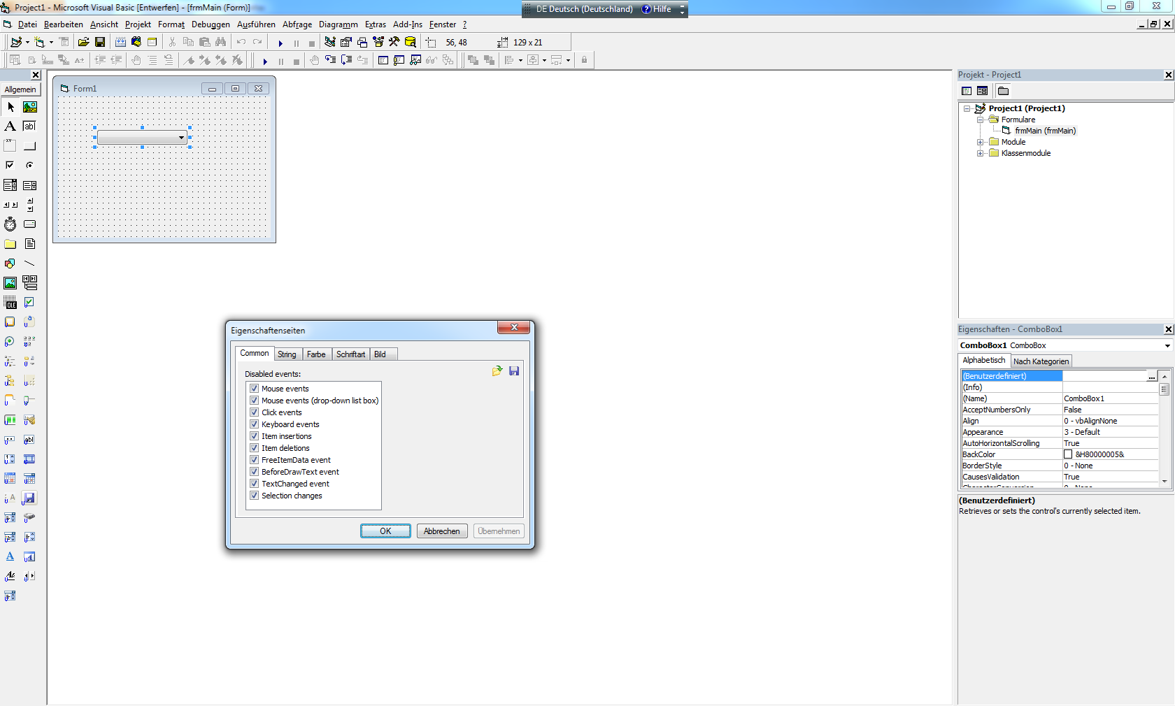 See this screenshot:pgrimmer wrote:I don't have a tool called the "form designer." In the standard VB6 IDE I can see properties for the ComboBox but I don't find anything related to "click events."